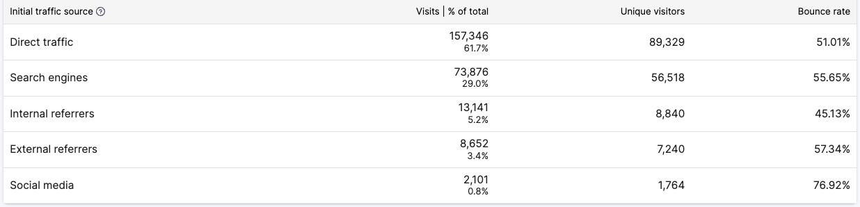 Referral traffic shows how many visitors came to your site by clicking a link on another website. It helps you understand which partnerships or mentions are driving results.