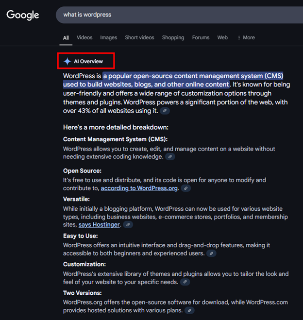 AI overviews, like those generated by Google’s Search Generative Experience, pull concise answers from top-ranking pages to give users a quick summary. If your content isn’t optimized for these summaries, you won’t be able to achieve the coveted top spot on the SERPs.