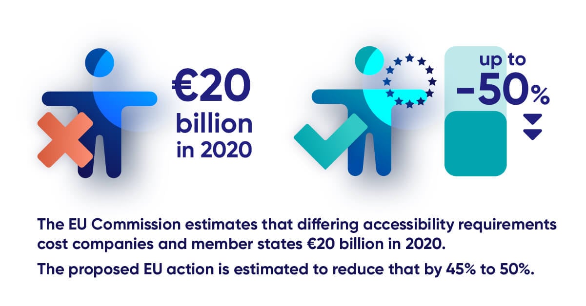 The EU Commission estimates that differing accessibility requirements cost companies and member states €20 billion in 2020. The EU action is estimated to reduce that by 45% to 50%.