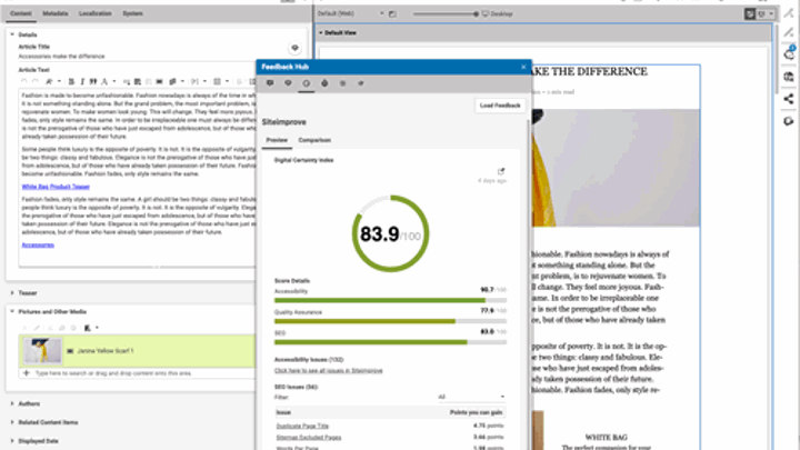 The Siteimprove CMS plugin bridges the gap between the CoreMedia content management system (CMS) and the Siteimprove Intelligence Platform. Now you can scan your website for errors before and after a page is published, allowing you to fix mistakes, optimize content, and manage your site more efficiently.